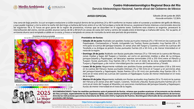 - Sábado 28 de junio: Nublado con posibles lluvias puntuales intensas (75 a 150 mm) en las cuencas del Papaloapan, Coatzacoalcos y Tonalá, incluyendo Los Tuxtlas; lluvias puntuales muy fuertes (50 a 75 mm) para la cuenca del Jamapa-Cotaxtla. En zonas altas del Tuxpan y Cazones y entre las cuencas del Tecolutla a La Antigua se prevén lluvias puntuales fuertes (25 a 50 mm) y de menor intensidad en el resto de la región.