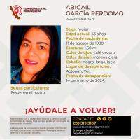 Abigaíl García Perdomo, tiene 43 años de edad; mide un metro con 60 centímetros; tiene ojos color café oscuro; cabello, negro, largo y lacio. La familia pide el apoyo de la ciudadanía para que otorguen cualquier dato que pueda ayudar a su pronta localización.