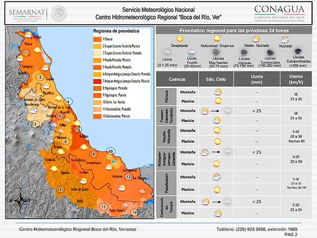 Se prevén lluvias en acumulados menores a 25 mm especialmente en la región montañosa central y “surada” con rachas de 50 km/h en Orizaba, parte baja del río Papaloapan y Coatzacoalcos.