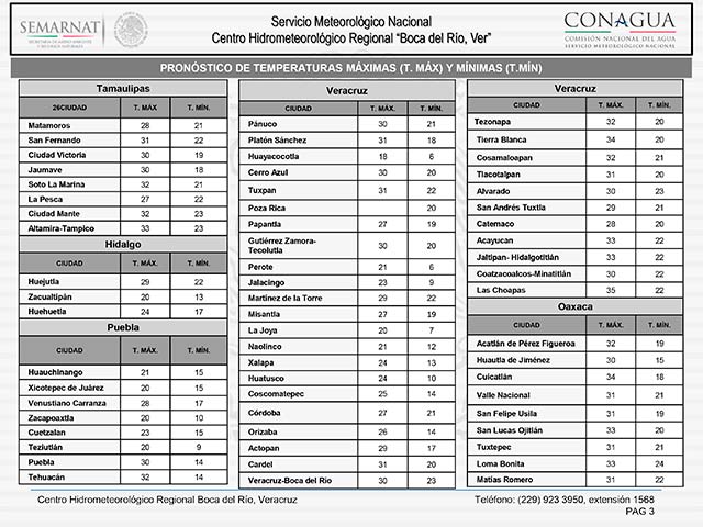 El viento será del Sur y Sureste con velocidades de 20 a 30 km/h, esperándose evento de “Surada” en la región de Orizaba y parte baja del río Papaloapan y Coatzacoalcos con rachas de 50 km/h. La temperatura mantendrá ambiente diurno cálido a caluroso en zonas de planicie y costa, así como templado a cálido en zonas serranas. Por la noche y madrugada se prevé ambiente frío en zonas montañosas con temperaturas cercanas a 5° C en la Sierra norte de Puebla, inmediaciones del pico de Orizaba y Cofre de Perote.