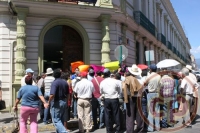 Integrantes del Movimiento Antorcha Campesina se manifestaron hoy en las oficinas del Sistema de Administración Tributaria (SAT), ubicadas en la calle de Lucio, para exigir a la Secretaría de Hacienda y Crédito Público federal que libere recursos aprobados en la Cámara de diputados para la construcción de caminos rurales y unidades deportivas.