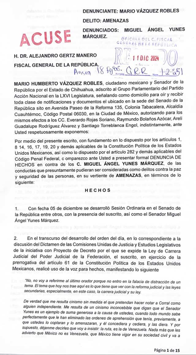 El senador del PAN Mario Vázquez Robles presentó este miércoles una denuncia de hechos ante la Fiscalía General de la República (FGR), contra su homólogo Miguel Ángel Yunes Márquez, por el delito de amenazas, derivadas de las palabras del veracruzano, quien fue hasta el escaño del panista el pasado 5 de diciembre durante la sesión del Pleno del Senado.