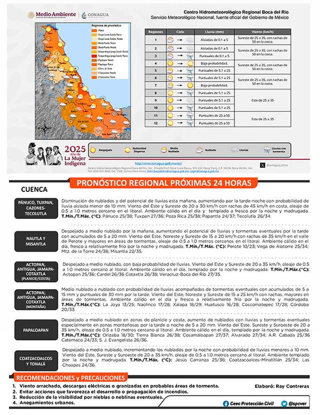 El viento dominará del sureste, este y noreste con velocidades de 20 a 35 kilómetros por hora y rachas de hasta 45 kilómetros por hora en la costa norte; variable en áreas de tormenta. El oleaje cercano al litoral oscilará entre 0.5 y 1.0 metros.