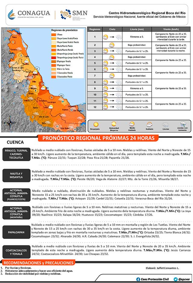 En el suroeste del Golfo de México se localiza una vaguada remanente del frente número 47. En Veracruz genera un martes medio nublado a nublado con nieblas, lloviznas y lluvias dispersas con acumulados de 5 a 10 milímetros, aunque también se notas áreas despejadas en especial en cuencas del sur.