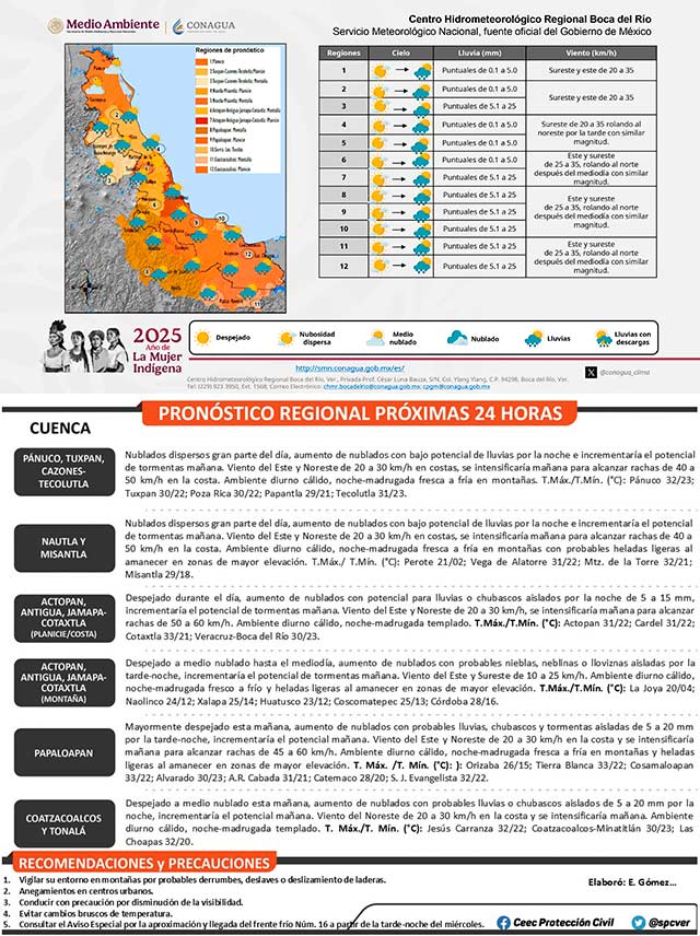 Jueves 27: Lluvias y tormentas aisladas. Acumulados de 5 a 30 milímetros en promedio en la entidad con máximos de 70 a 150 milímetros en zonas de llanura y costa de las cuencas del Pánuco al Tecolutla, así como en las cuencas del Nautla al Actopan, de 50 a 70 milímetros en el resto de las cuencas del Pánuco al Tecolutla y cuencas del sur, y de 20 a 50 milímetros en la región montañosa central. Viento del Noroeste y norte de 40 a 50 kilómetros por hora con rachas de 55 a 70 kilómetros por hora en la costa. Ambiente templado a fresco al mediodía y fresco a frío por la noche a madrugada con probabilidad de heladas en partes altas. Oleaje de 1.0 a 2.0 metros en las proximidades de la costa.