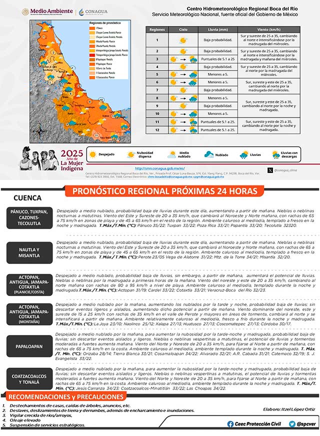A partir de mañana aumentará el potencial de lluvias y tormentas; además, se prevé “norte” de rápida itensificación con rachas máximas de 80 a 95 kilómetros por hora en la costa y descenso de la temperatura. Se recomienda a la población extremar las precauciones y consultar la Alerta Gris del Sistema de Alerta Temprana para Veracruz en su fase de accfión.