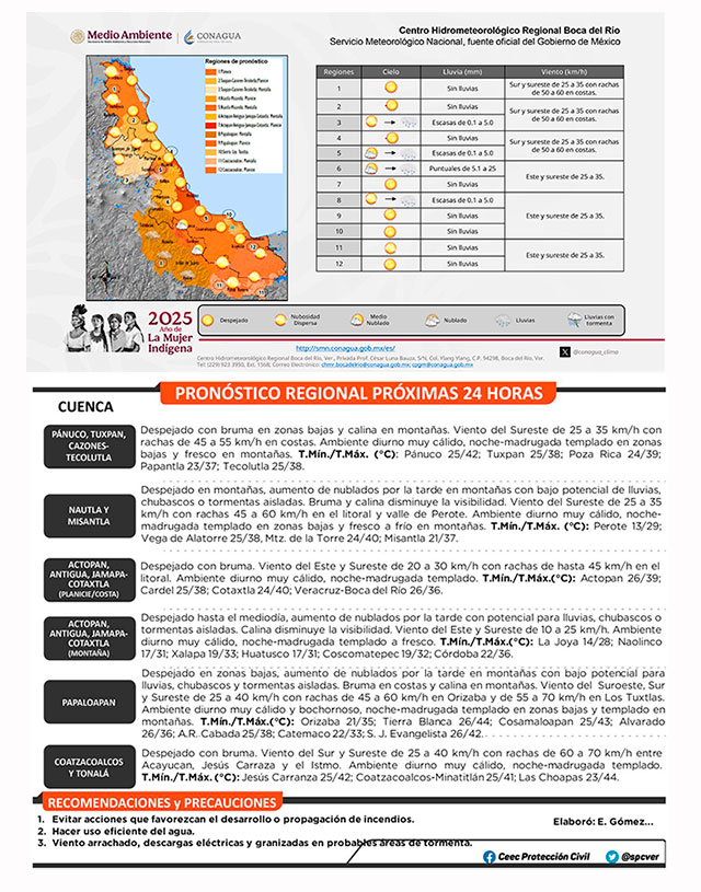 A partir de un amplio y profundo centro de baja presión ubicado en Texas, de donde se aloja el frente frío número 42 que cruza la región central de Chihuahua y una línea seca que se prolonga hasta el sur de Coahuila para continuar como vaguada hasta el centro del País, estos sistemas meteorológicos mantendrán durante las próximas 24 horas viento del sur y sureste con probables rachas frescas de 45 a 60 kilómetros por hora en la costa norte, Perote y Orizaba de 55 a 70 kilómetros por hora en Los Tuxtlas, Jesús Carranza y Acayucan. El ambiente diurno será cálido y bochornoso en Veracruz con bajo potencial de lluvias, sin descartar algunos eventos de corta duración por la tarde especialmente en montañas ubicadas en límites con Puebla. Tome sus precauciones.
