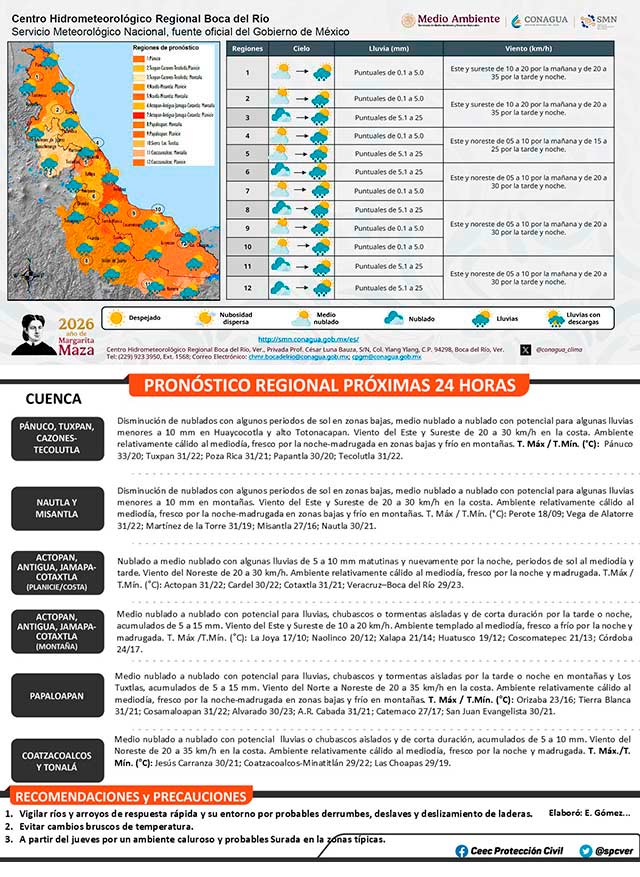 Para este día, el restablecimiento de la circulación anticiclónica en el Golfo de México y la vertiente oriental del país, sumado a una vaguada en el suroeste del Golfo de México, las condiciones locales y divergencia en altura, sumando a los remanentes de la masa de aire frío que acompañó al frente frío número 45 ocasionarán en la entidad veracruzana condiciones de cielo medio nublado a parcialmente nublado, con lluvias escasas o lloviznas de forma aislada en el norte de la entidad, con chubascos 5 1 a 25 milímetros) en regiones de montaña, mismos que se concentrarán entre la parte alta del Cazones al Nautla y la zona montañosa del centro y del Papaloapan, especialmente entre La Antigua y el Jamapa Cotaxtla.