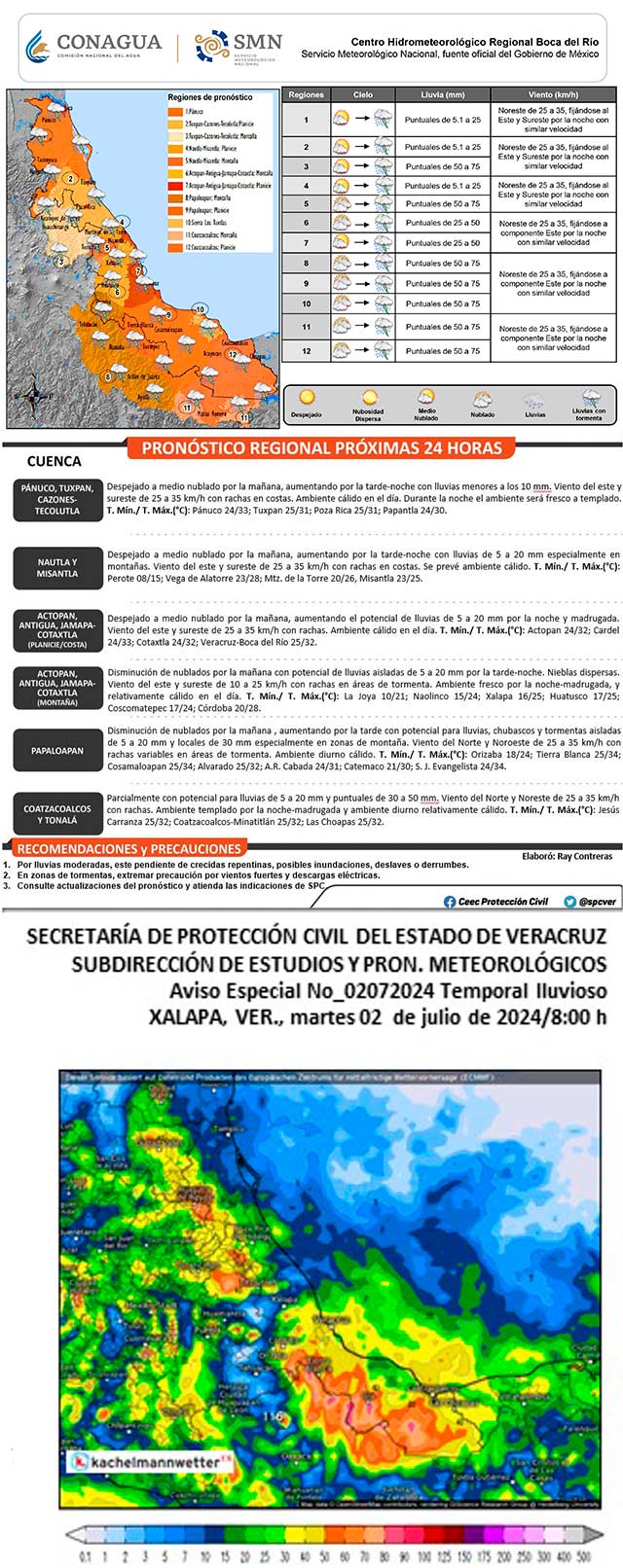 Aunque haya disminuido el potencial de lluvias se recomienda a toda la población, debido a la saturación del suelo, extremar las precauciones ante posibles deslaves, derrumbes y deslizamientos, así como la crecida de ríos y arroyos de respuesta rápida. Consulte actualizaciones de pronóstico y siga las instrucciones de las autoridades de Protección Civil.
