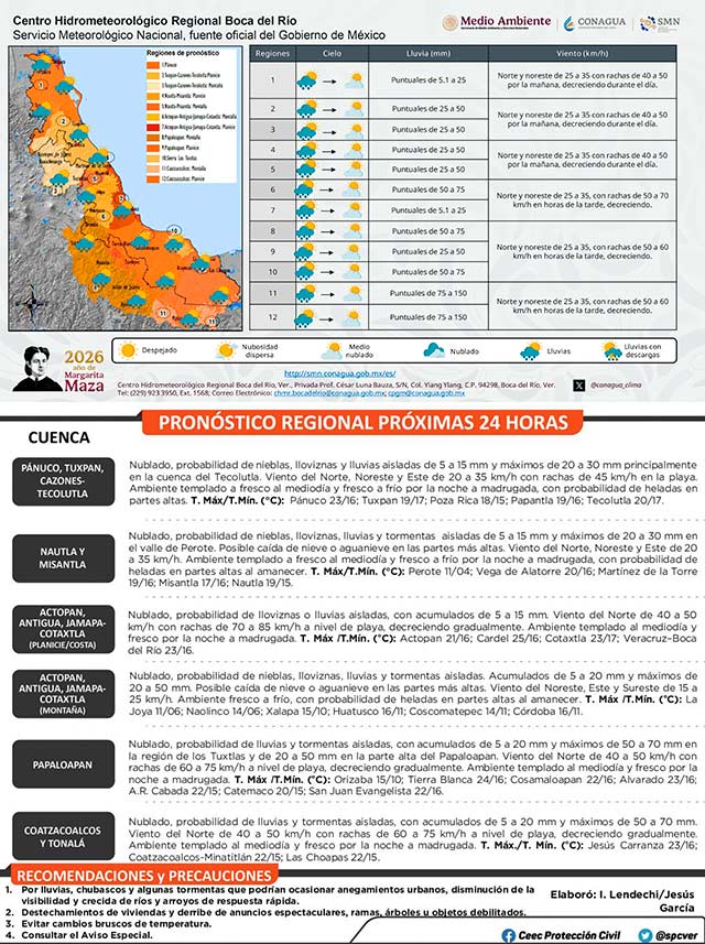 Se prevé potencial para lluvias y tormentas aisladas, con máximos en la región de Los Tuxtlas y entre las cuencas del Coatzacoalcos al Tonalá. El viento será del norte y noreste, con rachas de 70 a 85 kilómetros por hora en la costa centro y sur, decreciendo gradualmente. El ambiente diurno será templado a fresco, mientras que, por la noche y madrugada de fresco a frío, con posibles heladas en zonas serranas. Consulte el #AvisoEspecial.