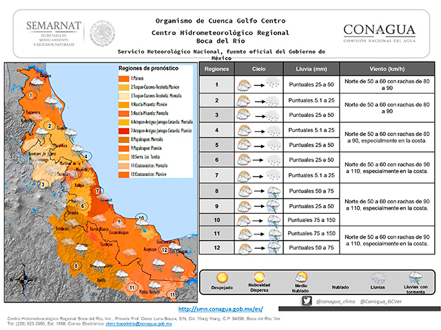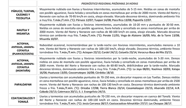 - Norte con rachas de 90-110 km/h dentro de ciudades costeras y de 110 a 130 km/h a nivel de playa y sobre mar; 60-80 km/h entre Misantla y Xalapa.