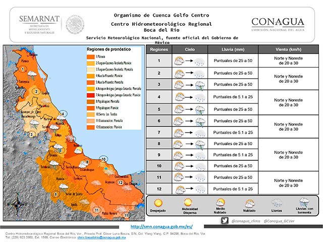 Se espera un día con cielo nublado a medio nublado en gran parte del estado de Veracruz con potencial de lluvias y tormentas especialmente en zonas serranas. Dominará ambiente cálido en zonas de costa y templado en zonas serranas. Extreme precauciones en áreas de lluvias o tormentas por reducción de la visibilidad.