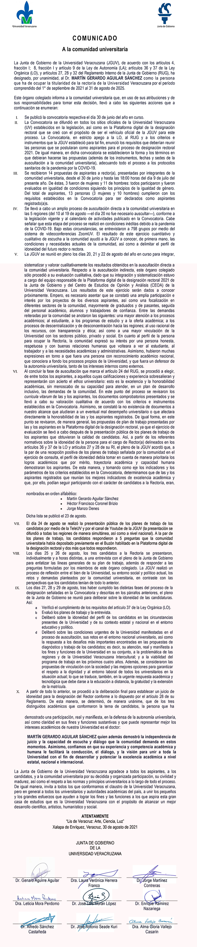De acuerdo con lo programado por la UV, tras esta designación, el martes 31 de agosto se entrevistará a las candidatas y candidatos a Secretarios y al día siguiente, Aguilar Sánchez rendirá protesta como el nuevo titular de la Rectoría, concluyendo así el proceso de designación.