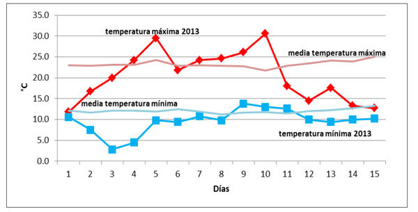 Ahora bien, haciendo un rápido análisis para los primeros quince días de marzo, se observa en la gráfica 1, el comportamiento de las temperaturas máximas y mínimas de este 2013 con el promedio histórico de los últimos 30 años, donde se puede observar que existen periodos donde se han registrado valores tanto de temperaturas máximas como mínimas por abajo de su promedio.