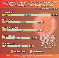 Estos cinco Estados sumaron 13 mil 854 “accidentados” por violencia intrafamiliar, cifra que representa el 50.8 por ciento del total nacional (27 mil 245).