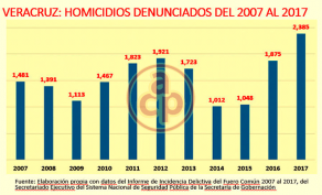 En la década que comprende el periodo de los años de 2007 al 2017, se denunciaron 17 mil 239 homicidios en el estado de Veracruz, de los cuales la mayor cantidad se registró en el 2017 que recién concluyó, de acuerdo a los informes de Incidencia Delictiva del Fuero Común, del Secretariado Ejecutivo del Sistema Nacional de Seguridad Pública (SESNSP) de la Secretaría de Gobernación (SEGOB).