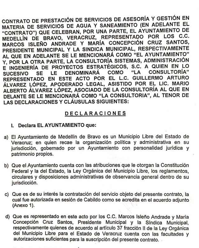 Con el respaldo del alcalde Marcos Isleño Andrade, el Cabildo de Medellín de Bravo acordó pagarle cada mes cerca de 60 mil pesos al mes a Sistemas Administrativos e Ingeniería de Proyectos Estratégicos (SAIPE) por “servicios de asesoría y gestión en materia de servicios de agua y saneamiento”, empresa que operaría irregularmente.