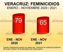 A noviembre de este año, la entidad veracruzana registró 65 feminicidios, 14 menos que en el mismo periodo del 2020, sin embargo, se mantiene como segundo del país en este delito de alto impacto, de acuerdo con datos del Secretariado Ejecutivo del Sistema Nacional de Seguridad Pública (SESNSP) de la Secretaría de Gobernación (SEGOB).