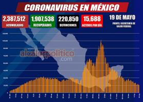 Al corte de este miércoles 19 de mayo, México acumuló 220 mil 850 muertes por COVID-19, esto es, 104 fallecimientos más que el día anterior, informaron autoridades sanitarias durante la conferencia vespertina sobre coronavirus en el país.