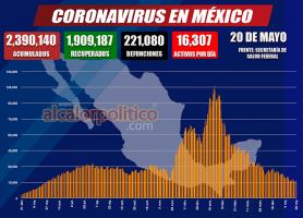 Al corte de este jueves 20 de mayo, México acumuló 221 mil 80 muertes por Covid-19, esto es, 230 fallecimientos más que el día anterior, informaron autoridades sanitarias durante la conferencia vespertina sobre coronavirus en el país.