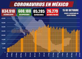 México acumuló, al corte de este 15 de octubre, 85 mil 285 muertes por Covid-19, con 834 mil 910 casos de contagios confirmados de coronavirus, según informaron autoridades de la Secretaría de Salud.