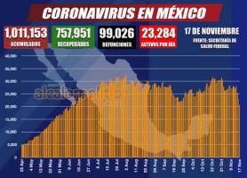 México llegó, al corte de este 17 de noviembre, a 99 mil 26 muertes por Covid-19, con 1 millón 11 mil 153 casos de contagios confirmados de coronavirus, según informaron autoridades de la Secretaría de Salud.