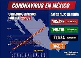 Además, en México hay 185 mil 122 casos acumulados, 4 mil 577 más con respecto al corte del domingo.