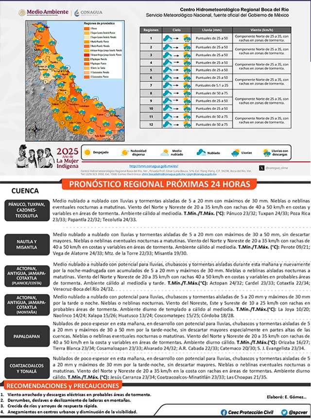 Una vaguada en superficie con eje sobre el oeste-suroeste del Golfo de México y áreas de divergencia del viento en la atmósfera alta ocasionadas por la circulación de un anticiclón centrado al sur de Baja California Sur y una vaguada superior del norte a suroeste del Golfo de México. Esta situación meteorológica mantendrá en las siguientes 24 a 48 horas condiciones típicas de la temporada, es decir, ambiente diurno cálido en gran parte de la entidad y noches-madrugadas frescas a frías especialmente en altas montañas. El viento del noreste y noreste moderado en costas y potencial para lluvias, chubascos o tormentas aisladas, previendo acumulados generales de 5 a 20 milímetros y algunos locales de 30 a 50 milímetros.