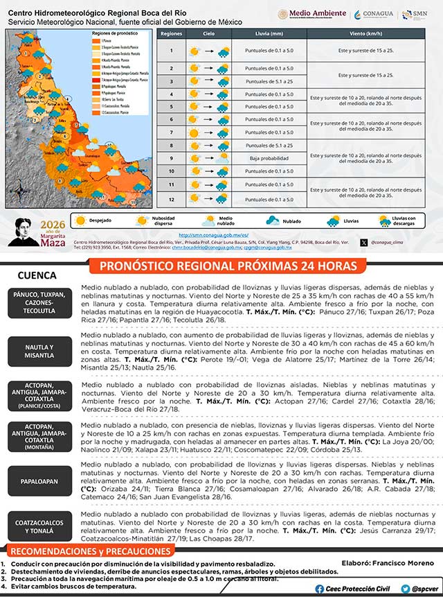 El viento, que venía dominando del este y sureste, tenderá a cambiar al norte/noreste con rachas moderadas principalmente sobre el litoral veracruzano, mientras que el ambiente se mantendrá fresco a cálido durante el día; por la noche, madrugada y al amanecer persistirá ambiente fresco a frío, con probabilidad de heladas en zonas de mayor altitud. Se recomienda atender los avisos y recomendaciones que emita la Secretaría de Protección Civil.