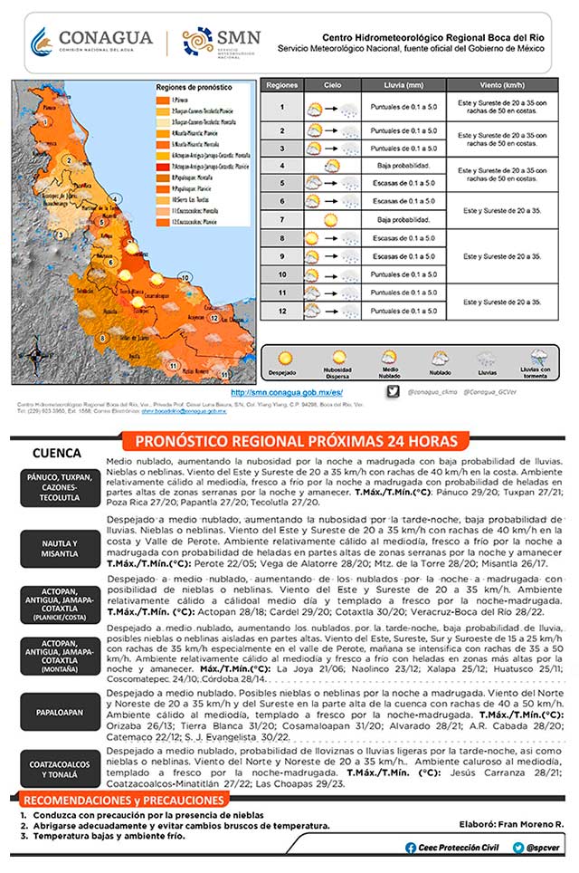 Viento del sureste, este y noreste de 20 a 35 kilómetros por hora en costas. Posible surada de 40 a 55 kilómetros por hora en las regiones típicas. Ambiente diurno cálido. Por la noche a madrugada prevalece ambiente fresco a frío con posibles heladas en partes altas. El frente número 25, recorrerá el estado de Veracruz el día viernes, por lo cual se espera un incremento en los nublados, así como del potencial para lluvias. Por su parte, la masa de aire frío que le da impulso generará viento del norte con rachas de 70 a 85 kilómetros por hora.