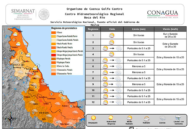 La circulación anticiclónica sobre el Golfo de México favorecerá condiciones de cielo despejado a medio nublado en Tamaulipas y Veracruz, sin embargo, condiciones locales favorecerán el incremento de nubosidad hacia regiones montañosas en horas de la tarde y noche, previendo que en Tamaulipas se presenten lluvias escasas o lloviznas (0.1 a 5 mm), especialmente en la cuenca del Río Bravo, así como la región de la Sierra Madre; por su parte, en Veracruz se prevén lluvias con intervalos de chubascos (5.1 a 25 mm) especialmente en partes altas de las cuencas de los ríos Tecolutla, Nautla, Misantla, Papaloapan, Coatzacoalcos y Tonalá.