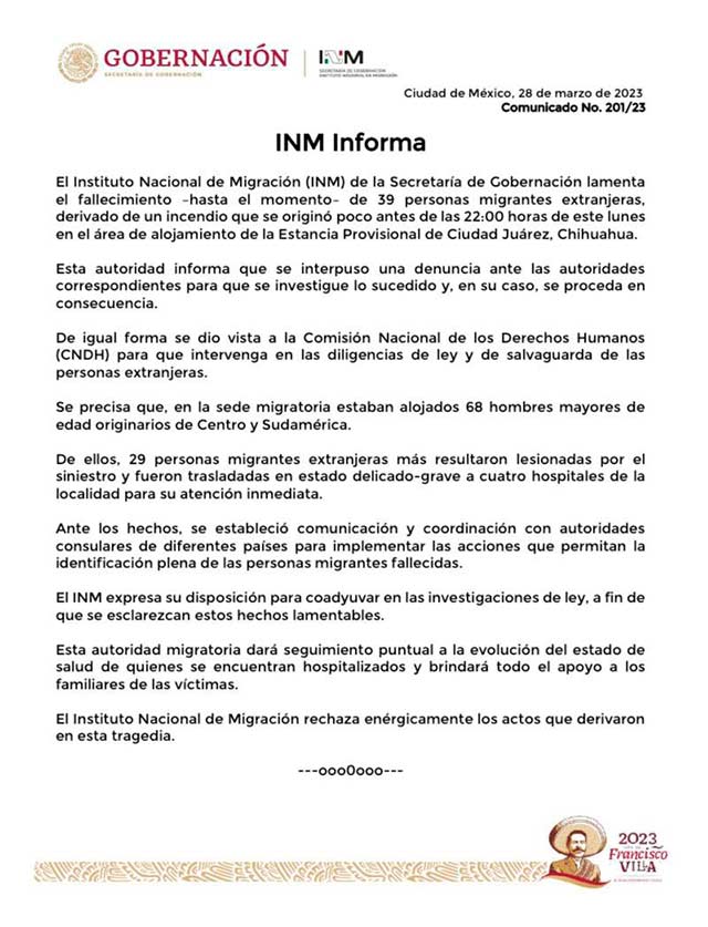 “Quiero informar algo muy lamentable, muy triste: anoche como a las 9: 30 de la noche se produjo pues un incendio en un albergue de migrantes en la frontera, en Ciudad Juárez, y tenemos hasta ahora, como informe, que perdieron la vida 39 migrantes. Esto tuvo que ver con una protesta que ellos iniciaron a partir, suponemos, de que se enteraron que iban a ser deportados, movilizados. Y como protesta en la puerta del albergue, pusieron colchonetas y les prendieron fuego y no imaginaron que esto iba causar esta terrible desgracia.