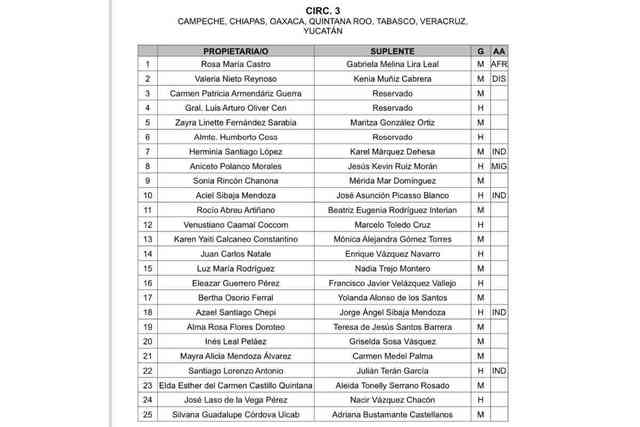 Según recoge Animal Político, la nueva lista de la tercera circunscripción queda con la activista por los derechos de los afrodescendientes, Rosa María Castro en la primera posición y con Gabriela Melina Lira Leal como suplente. Le sigue en la segunda posición Valeria Nieto Reynoso, presidenta municipal de Pueblo Viejo y distinguida como la primera alcaldesa invidente del País; le suple Kenia Muñiz Cabrera. El tercer puesto es para la estrella del reality show Shark Tank, Patricia Armendáriz Guerra.