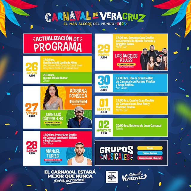 Veracruz, Ver., 24 de junio de 2025.- Por las condiciones meteorológicas en el Puerto, la coronación y los conciertos masivos del Carnaval de Veracruz 2025 cambian de sede; se realizarán en el World Trade Center a las 21:30 horas.