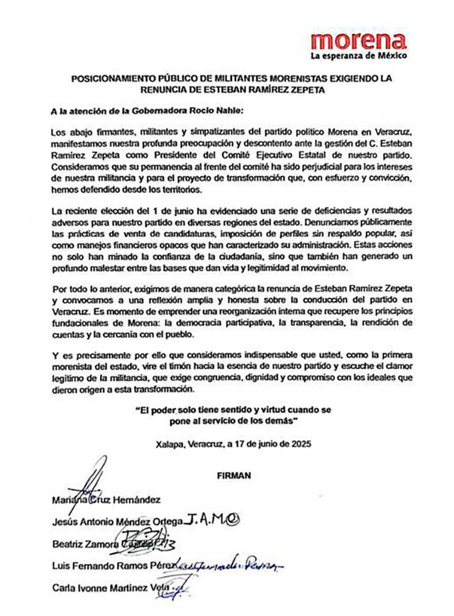 Militantes y simpatizantes del Movimiento Regeneración Nacional (MORENA) en Veracruz exigieron públicamente, a través de un comunicado, la renuncia de Esteban Ramírez Zepeta como presidente del Comité Ejecutivo Estatal del partido.