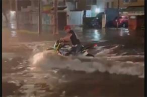 La fuerte lluvia de la madrugada de este domingo, provocó que, en calles bajas de la zona norte de la ciudad, se formaran prácticamente ríos, el motociclista intentó pasar, pero fue arrastrado.