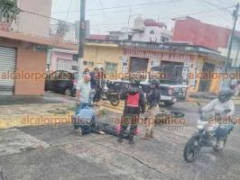 La mañana de este lunes se registró el choque de una motocicleta contra un taxi en el cruce de la calle Francisco I. Madero con la avenida 20 de Noviembre, en Xalapa; el tripulante de la moto resultó lesionado.