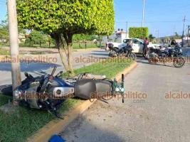 Un elemento de la Policía Estatal motorizado resultó lesionado luego de impactar contra la parte frontal de una camioneta Nissan color blanco, sin placas de circulación, propiedad de una empresa dedicada al procesamiento de cítricos.