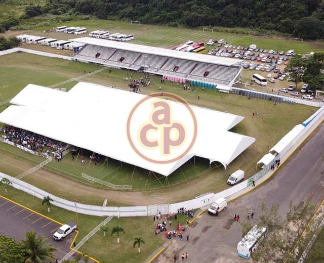 Tuxpan, Ver., 13 de noviembre de 2022.- Autobuses repletos de personas provenientes de Tihuatlán, Álamo, Tamiahua, Pánuco, Cerro Azul y Tantoyuca llegaron a la Unidad Deportiva para el evento de la jefa de Gobierno de la CDMX, Claudia Sheinbaum. “Venimos en el acarreo de los camiones y queremos ver a la próxima Presidenta”, dijo una mujer.
