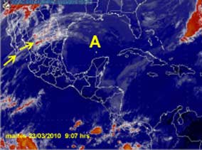 La interacción entre el modificado sistema de alta presión que se ubica sobre el Golfo de México y un sistema de baja presión que se ubica sobre el centro de los Estados Unidos, favorece la entrada de aire marítimo tropical con bajo contenido de humedad hacia la vertiente oriental del país, el cual ocasiona en la región cielo despejado a medio nublado. La corriente de vientos máximo ( ) comienza a reactivarse, ocasionado nubosidad alta sobre el Norte del país.
