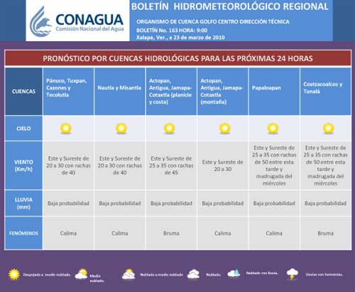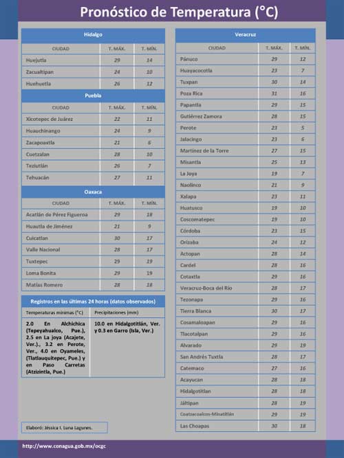 Asimismo es probable favorezca un evento de “surada” durante las madrugadas de mañana miércoles y jueves en las zonas de Orizaba, Los Tuxtlas y parte baja de la cuenca del río Coatzacoalcos con velocidades de 25 a 35 km/h con rachas de 50 km/h.