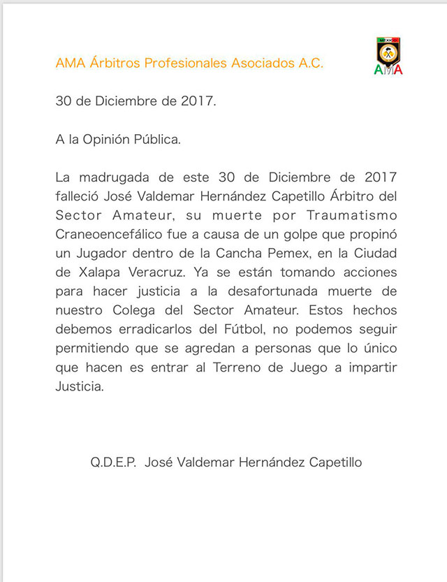 La madrugada de este sábado 30 falleció en Xalapa, Veracruz, el árbitro de futbol, José Valdemar Hernández Capetillo, miembro de “Árbitros Profesionales Asociados AC” tras una semana de permanecer en estado de coma, después de que el domingo 24 de este mes de diciembre fue agredido por un jugador, al que le sacó tarjeta roja durante el desarrollo de un partido en la cancha “PEMEX - El Castillo”