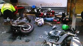 Tres motociclistas muertos es el saldo de un accidente ocurrido la mañana de este domingo en la autopista México-Veracruz, carril de bajada, tramo Acatzingo-Maltrata, como consecuencia de una carambola múltiple propiciada por una densa neblina y llovizna que se registra desde la madrugada.