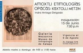 Este jueves 15 de junio a las 19:00 horas se inaugura en la Galería-Mezzanine del Museo de Antropología de Xalapa (MAX) de la Universidad Veracruzana (UV) la exposición “Amoxtli Etimologías Opacas: Kaxtolli Metzin”, proyecto que la artista Indra Arriaga Delgado creó luego de 5 años de trabajo con más de 30 colaboradores, algunos provenientes de otros idiomas y países.