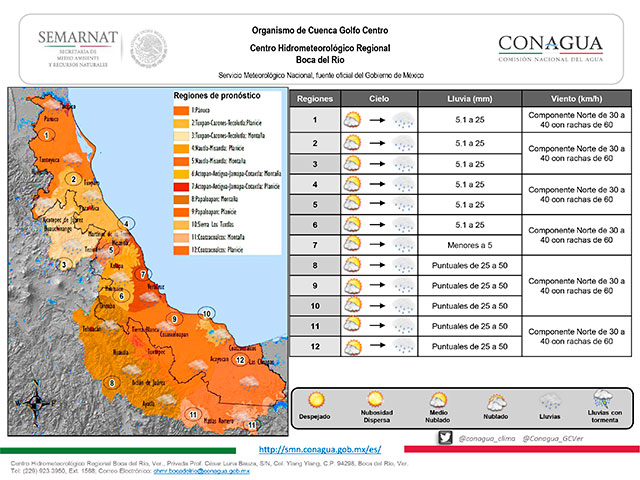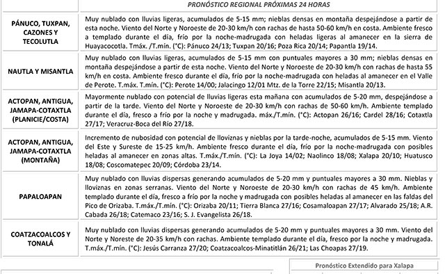 Por su parte, el reforzamiento de aire frío y aumento de la presión favorecerán un evento “Norte” débil a moderado de corta duración con rachas de 45-60 km/h especialmente en límites con el estado de Tamaulipas, favoreciendo ambiente fresco durante este lunes, tornándose frío esta noche y amanecer de martes, siendo probables heladas en el valle de Perote, faldas del Pico de Orizaba y Sierra de Huayacocotla.