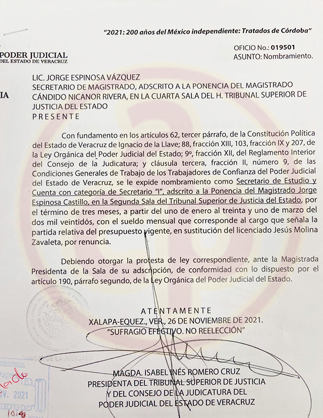 El nombramiento, firmado por Isabel Romero Cruz, es dirigido a Jorge Espinosa, en donde le informa su designación como Secretario de Estudio y Cuenta con categoría de Secretario “I”, adscrito a la Ponencia de su padre Magistrado, en la Segunda Sala del Tribunal Superior de Justicia del Estado, por un término de tres meses, a partir del 1° de enero al 31 de marzo del 2022, con el sueldo mensual que corresponde al cargo, en sustitución de Jesús Molina Zavaleta.