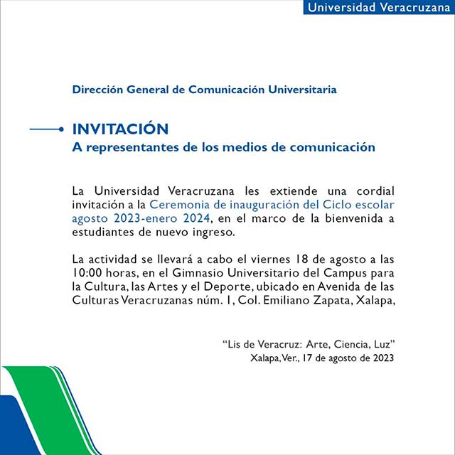 “La Universidad Veracruzana les extiende una cordial invitación a la Ceremonia de inauguración del Ciclo escolar agosto 2023- enero 2024, en el marco de la bienvenida a estudiantes de nuevo ingreso.