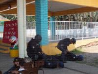 En el ejercicio, elementos de la Policía Municipal de esa localidad, simulaban un hecho de violencia portando chalecos antibalas, cascos, rifles de asalto y uniformes.