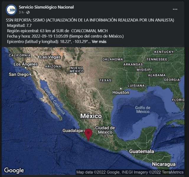 El Sismológico Nacional ajustó a la magnitud 7.7, ubicando el epicentro a 63 kilómetros al sur de Coalcomán, Michoacán, a las 13:05 horas, ocasionando que sonara la alarma sísmica en algunos municipios.