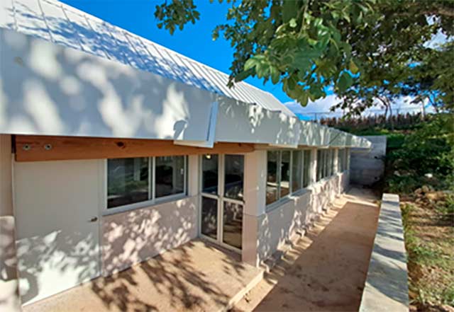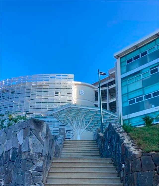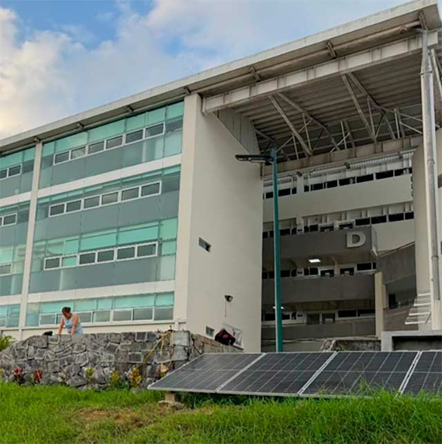 Fachada principal del Edificio B y sistema de captación pluvial con bombeo solar del Edificio de la Facultad de Matemáticas, Física y el Instituto de Inteligencia Artificial.